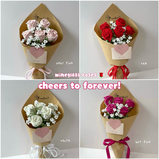 [AVAIL IN 4 COLOURS] cheers to forever - crochet wineglass rose flower bouquet 🍷❤️🌹‧˚。⊹ ˖
