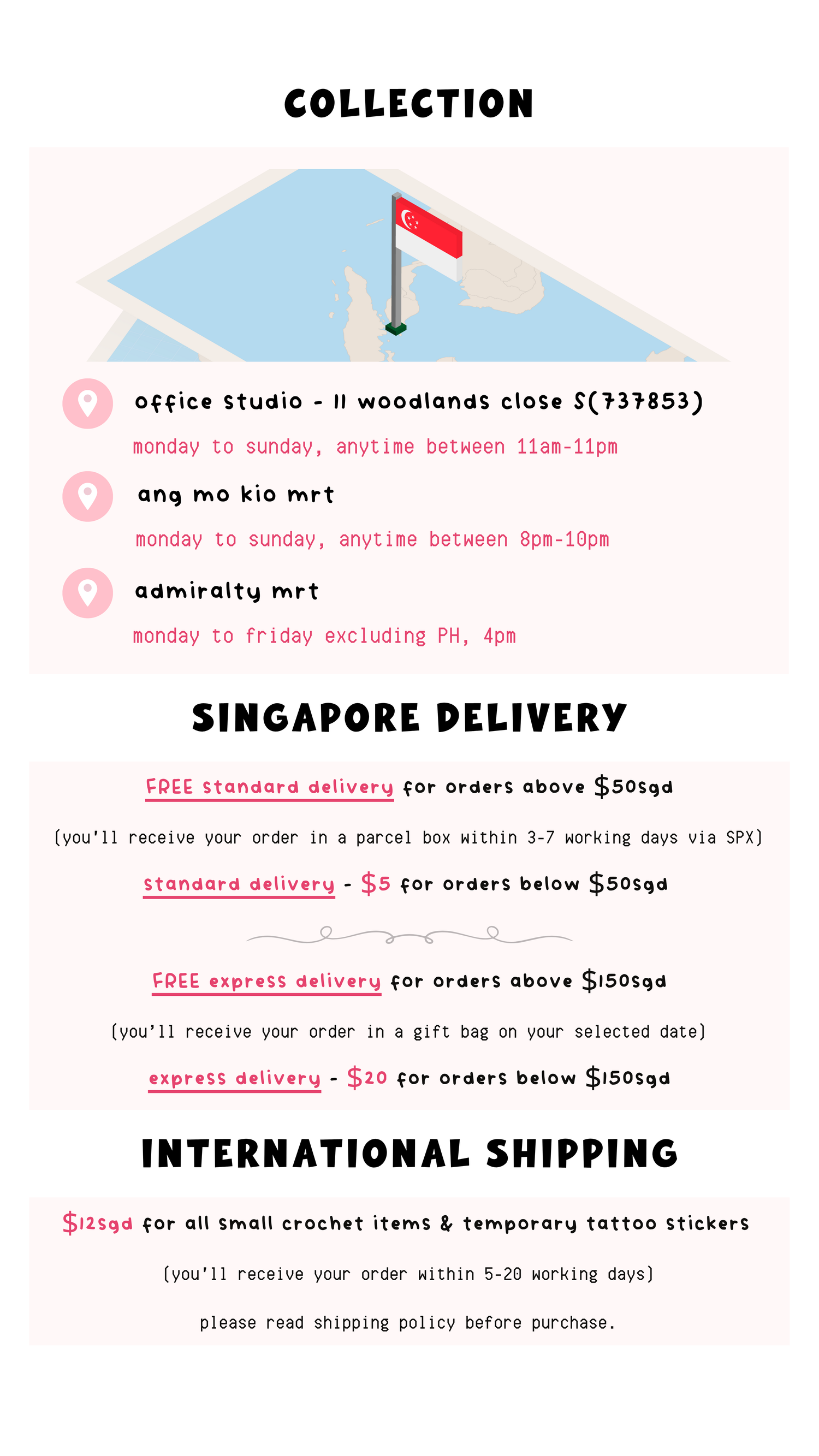 𓈒⟡₊⋆∘ currently, we only ship small crochet items and temporary tattoo stickers internationally from singapore via the national postal service. these will typically arrive at your destination anytime between 10 - 20 business days. shipping to non-capital cities may take longer.