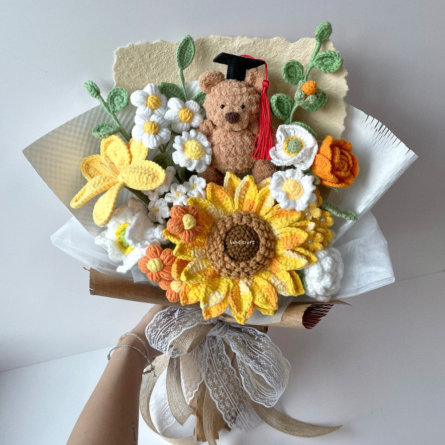 say hello to “a bear-y proud moment” — a special graduation bouquet designed to celebrate not just the milestone, but the heart and journey behind it. nestled among cheerful handmade crochet blooms is everyone's favourite jellycat-inspired bartholomew bear, ready to cheer on your favourite graduate with the warmest bear hug and the brightest sunflower smile 🌻🧸
