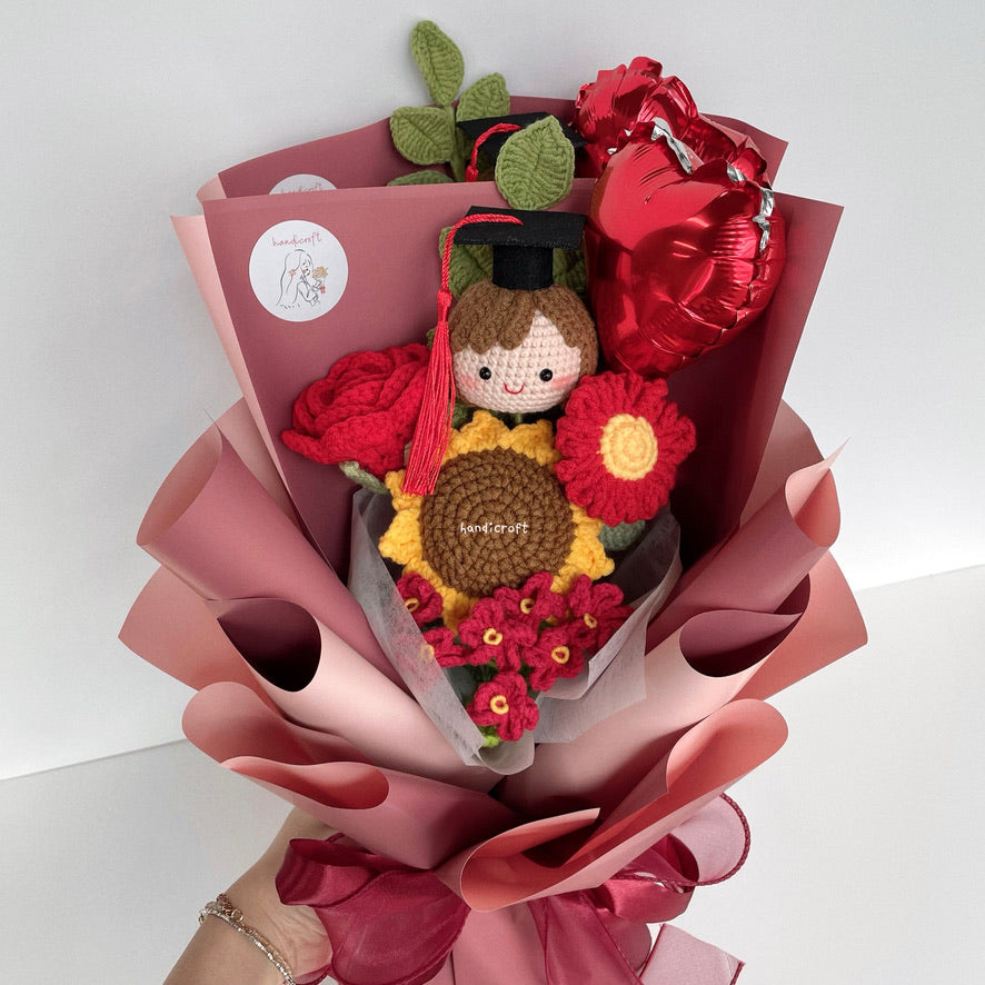 all handicroft handmade crochet graduation flower bouquets are timeless keepsakes that celebrate the achievement of a lifetime. unlike fresh flowers, these crochet blooms will never fade, preserving the memories of this special day forever. a lasting reminder of hard work, dedication and success — this bouquet truly lasts forever 🎓🌸 happy graduation to all graduates!
