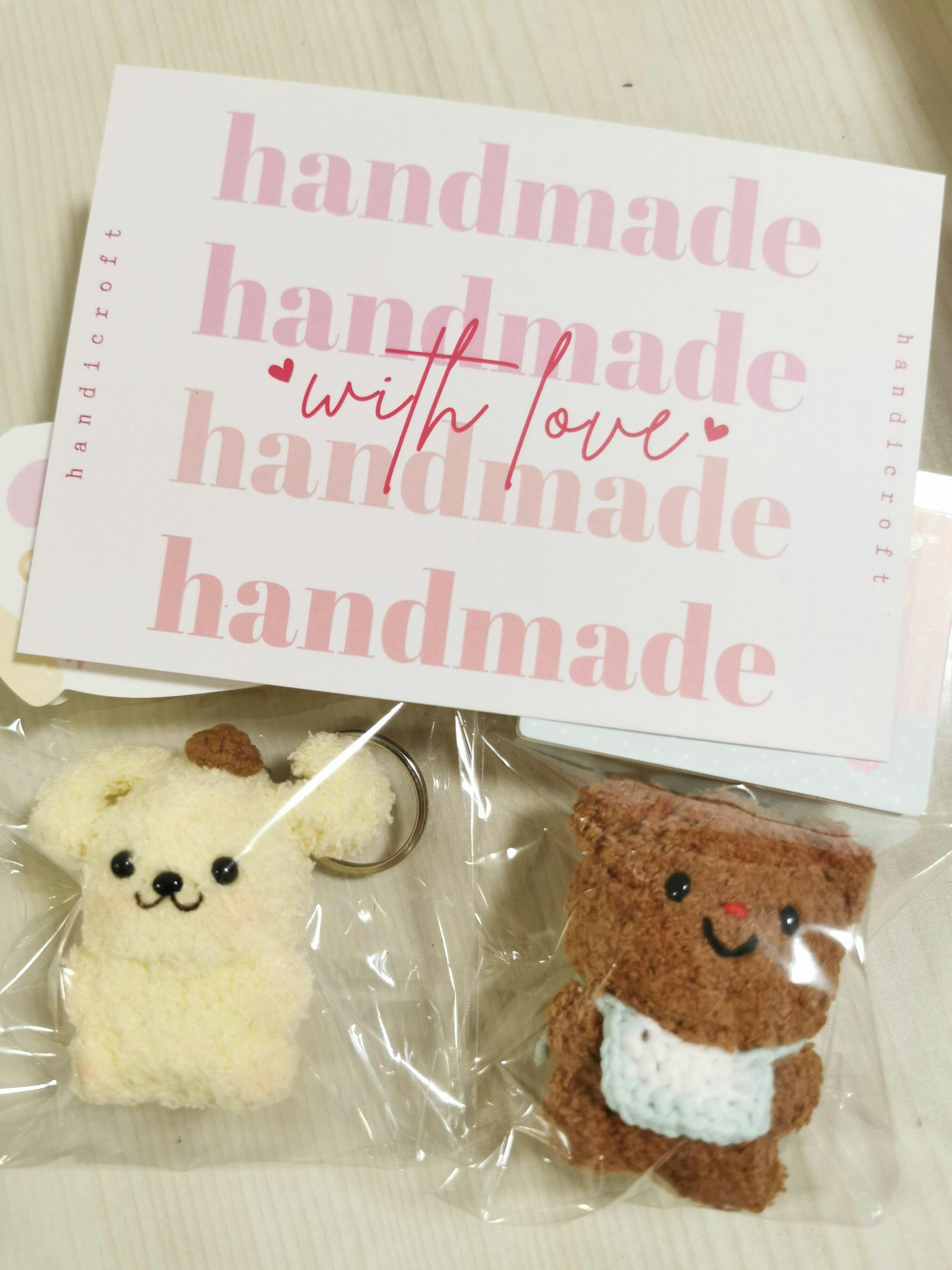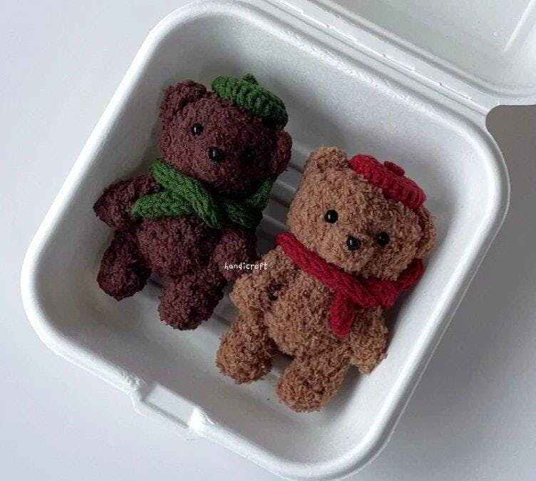 this handmade crochet teddy bear keychain is the ultimate cosy companion! with its fluffy soft body and sweet little scarf, itβs as snug and adorable as can be. available in both light and dark brown, this teddy bear is the perfect little bundle of warmth and charm to carry around. whether you hang it on your keys, bag or anything else, itβs sure to bring a smile and a comforting touch wherever you go. the perfect mix of cuddly and cute β your new favourite pocket-sized friend! π§Έβ¨