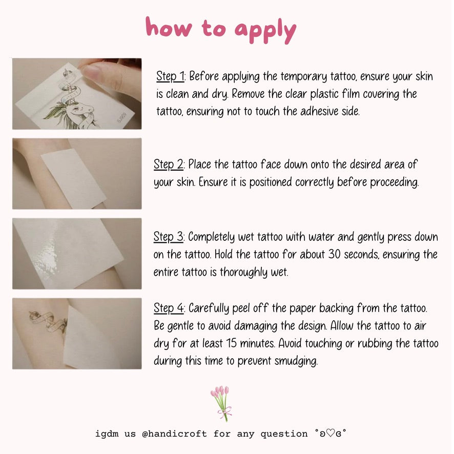 how to apply: peel off plastic film and apply the tattoo sticker face down onto clean, dry skin. wet with water for 30 seconds and remove paper gently.